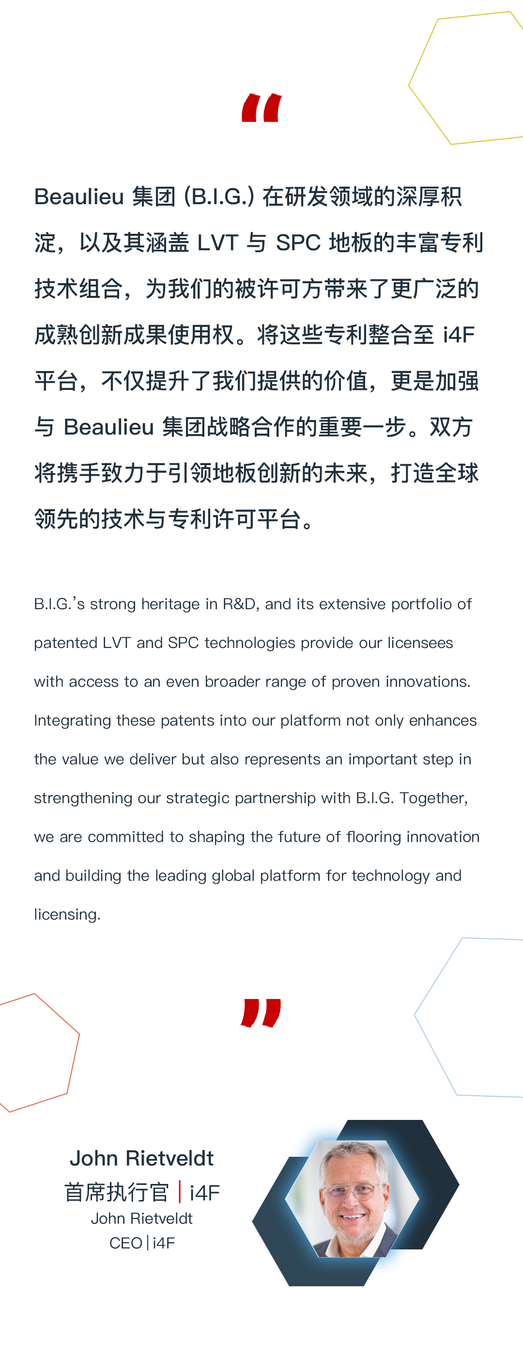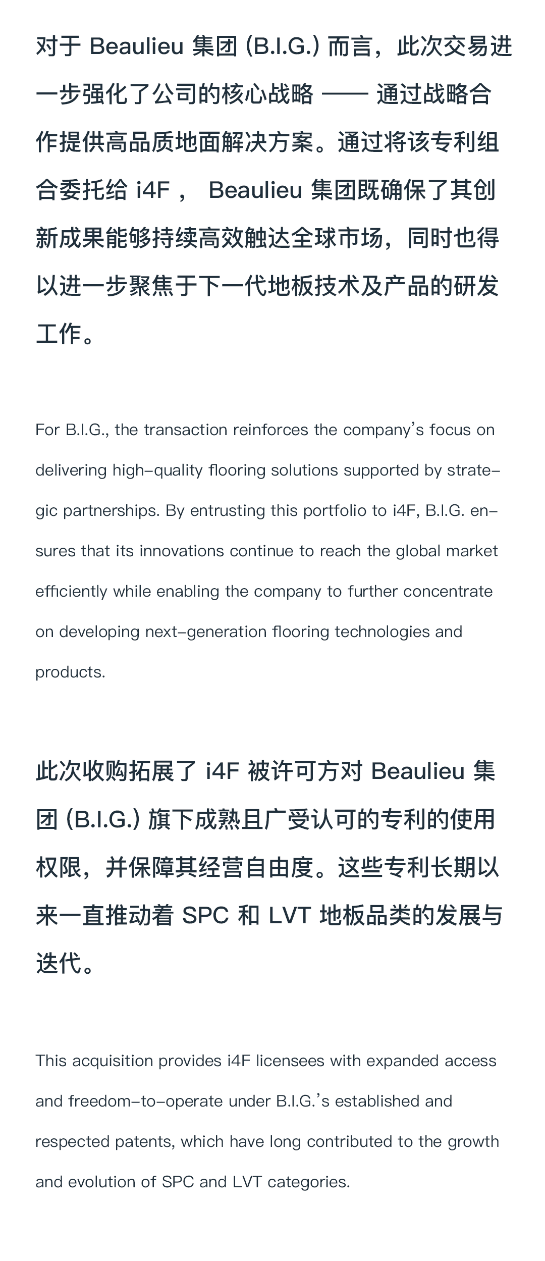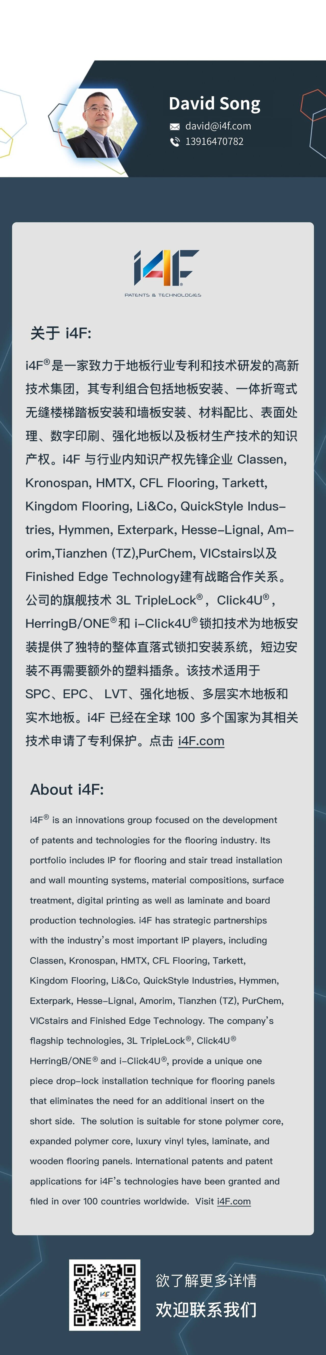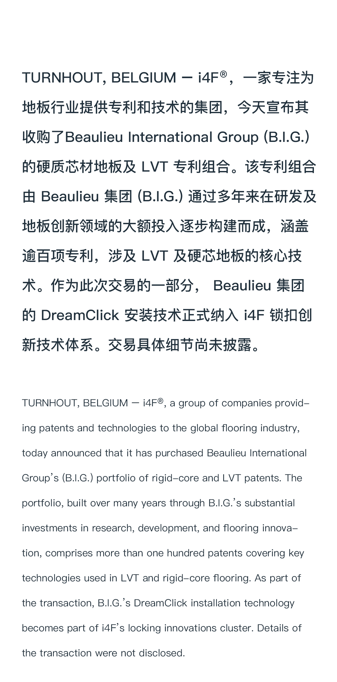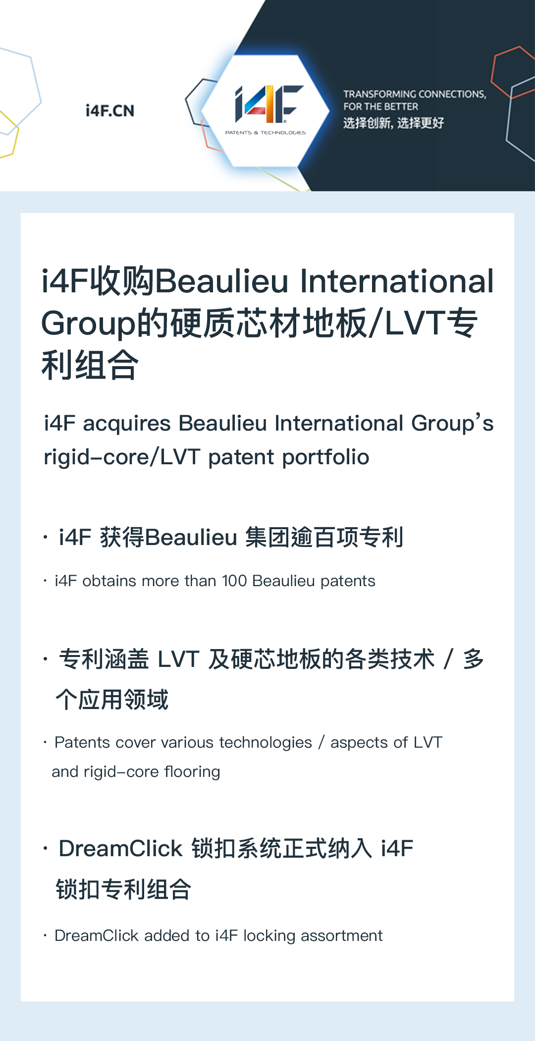 查看所有新闻 2025年 12月 12日 i4F收购Beaulieu International Group的硬质芯材地板/LVT专利组合 最新动态 2025年 12月 12日 i4F收购Beaulieu International Group的硬质芯材地板/LVT专利组合 阅读文章 2025年 12月 12日 持续远见,凝聚力量:i4F 总部年度战略部署,引领创新下一程 阅读文章 2025年 12月 12日 静音与柔触:i4F Silent Touch® 如何重塑家居环境的“感官体验”? 阅读文章 查看所有新闻