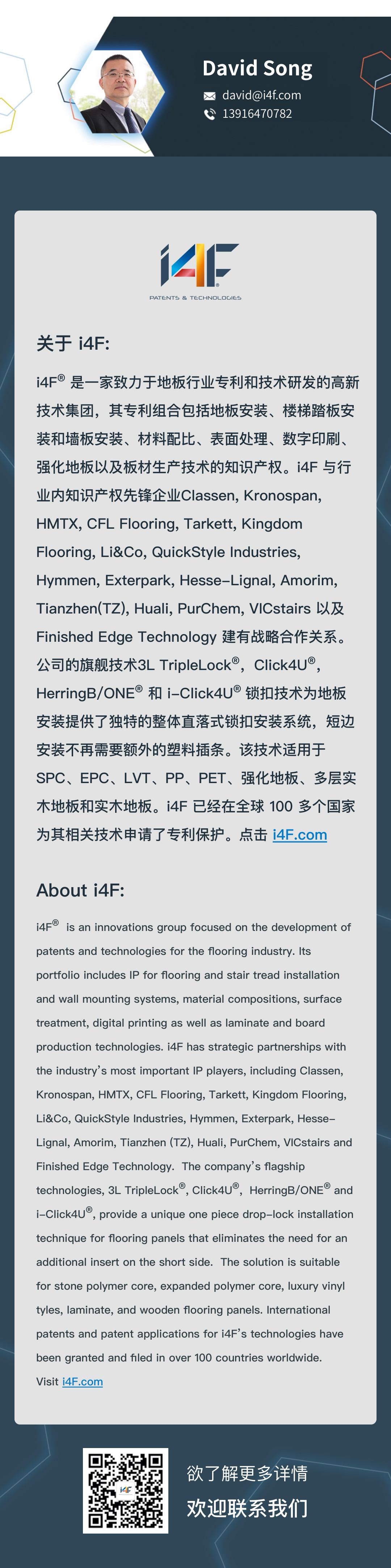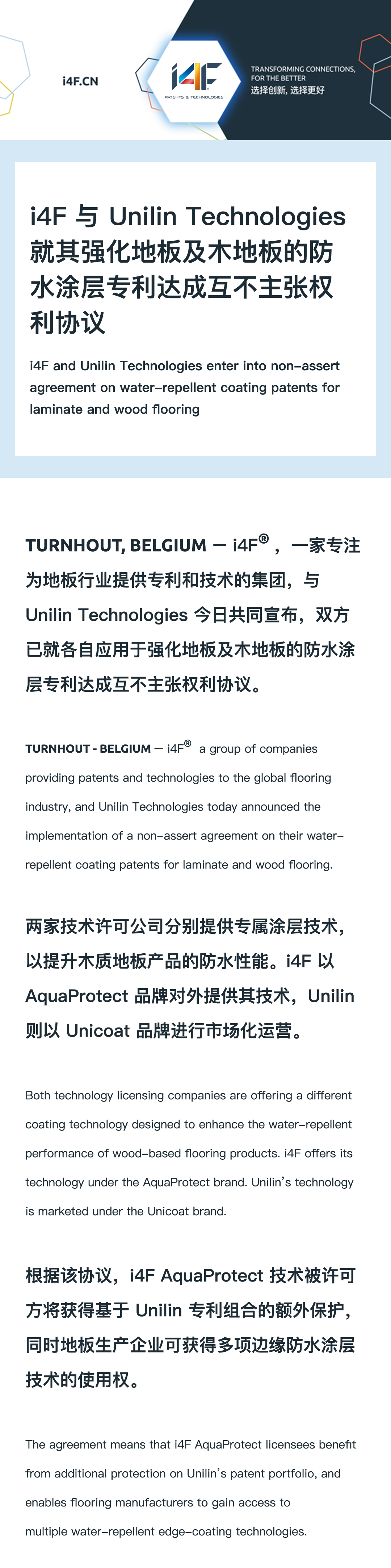 i4F 与 Unilin Technologies 就其强化地板及木地板的防水涂层专利达成互不主张权利协议